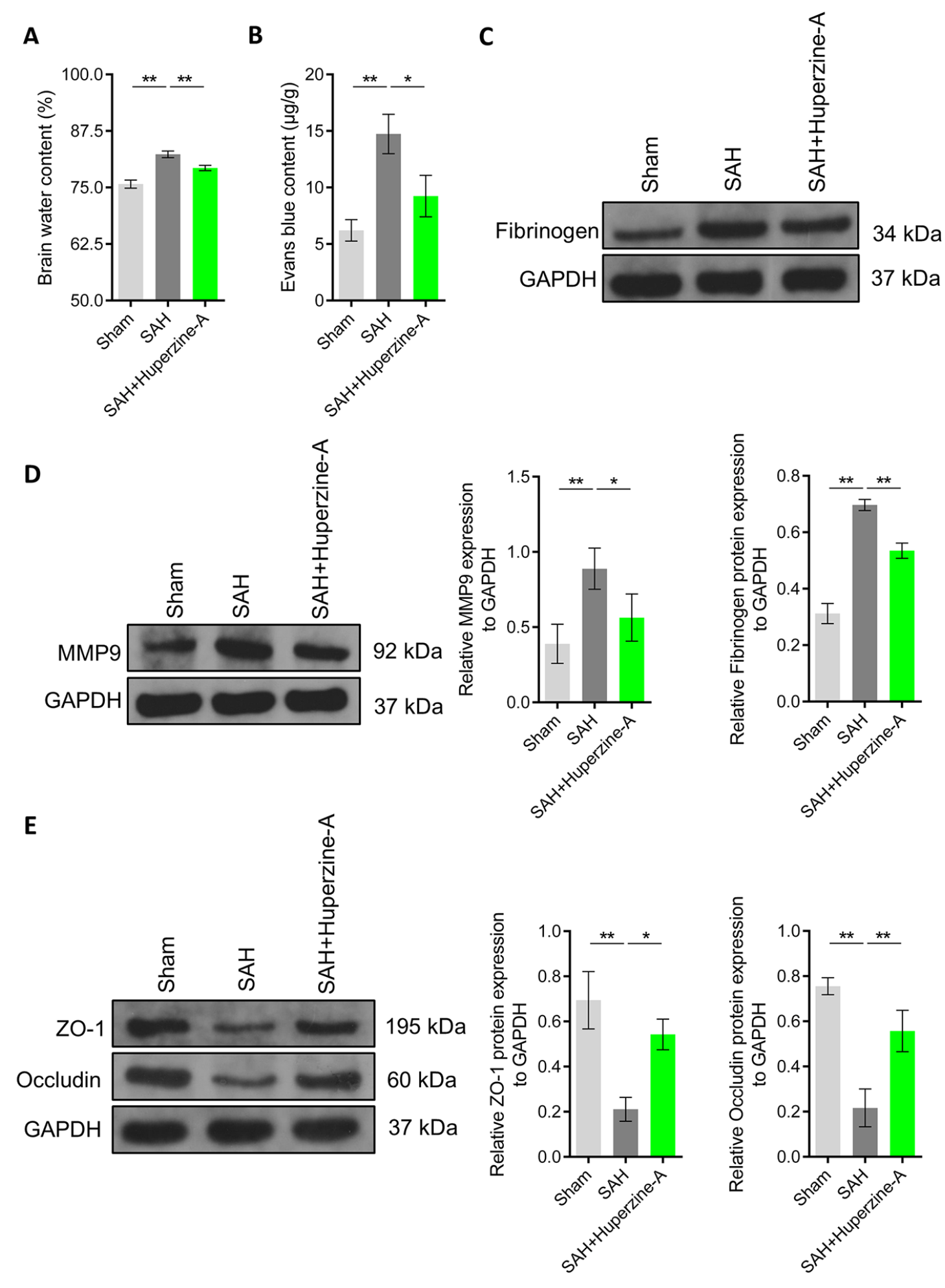 二、石杉碱甲通过改善 SAH 大鼠紧密连接蛋白的表达来抑制 BBB 功能障碍。