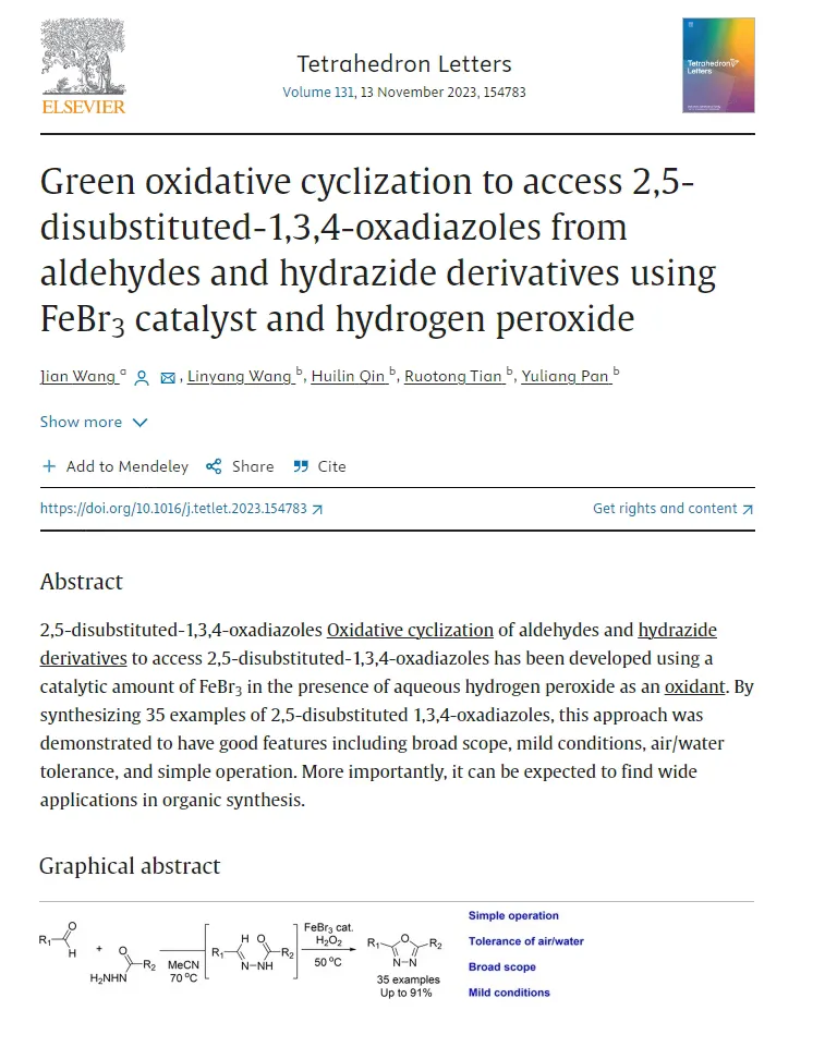 近日,万邦德制药集团博士后科研工作站在站博士后——王健博士,在科研领域取得重要进展,其研究成果《Green oxidative cyclization to access 2,5-disubstituted-1,3,4-oxadiazoles from aldehydes and hydrazide derivatives using FeBr3 catalyst and hydrogen peroxide》,在Tetrahedron Letters上发表。王健博士为该论文的第一作者及通讯作者,福建师范大学项生昌教授为合作导师。