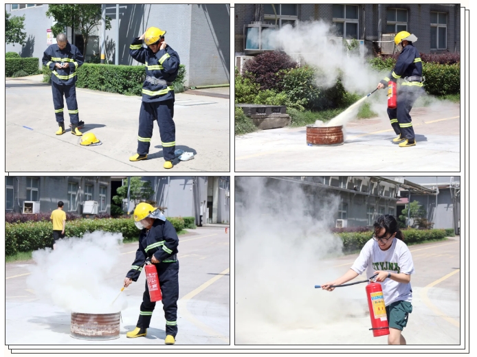 “各就各位,预备”,随着发令员一声令下,参赛选手迅速穿上防火服,拎起灭火器直冲终点。检查灭火器压力是否正常,将灭火器上下颠倒摇晃使干粉松动,拔掉铅封,拉出保险销,一只手抓喷管,另一只手握压把,对准油桶火焰根部扫射。一套操作有条不紊,规范迅猛地将火扑灭。