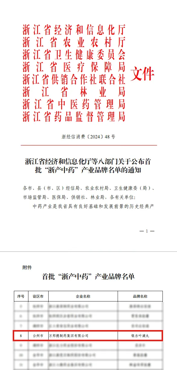 近日,浙江省经济和信息化厅等八部门发布《关于公布首批“浙产中药”产业品牌名单的通知》(浙经信消费〔2024﹞48号)文件,经企业自愿申报、地方审核推荐、专家评审、部门会商、网上公示等程序,在首批“浙产中药”产业品牌遴选中,万邦德制药集团有限公司的银杏叶滴丸产品荣登榜单!