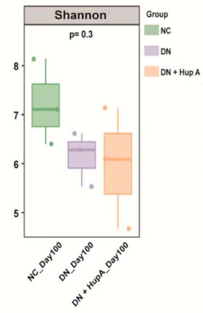4. 肠道微生物群改善:Shannon指数是评估微生物群落多样性或丰富度的常用指标,数值越高表明群落的多样性越高,故研究用其来评估石杉碱甲对大鼠肠道微生物群的影响。结果显示,DN组的Shannon多样性指数降低,而DN+Hup A组的Shannon多样性指数增加,表明石杉碱甲处理调节了大鼠肠道微生物群多样性。(如下图)