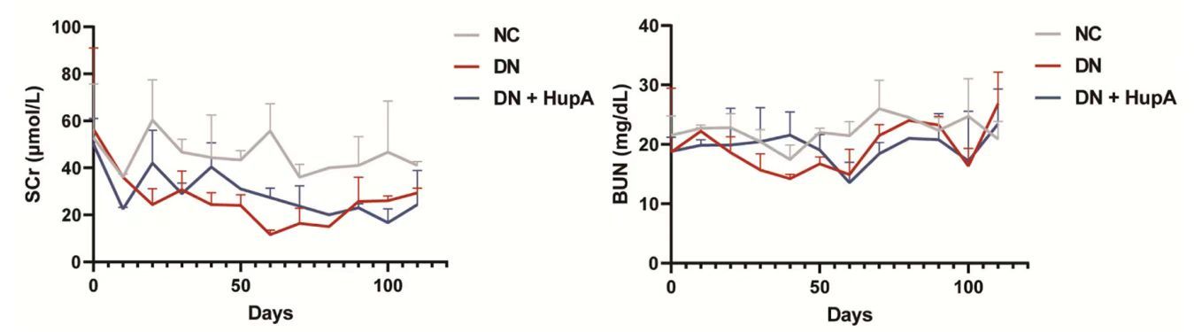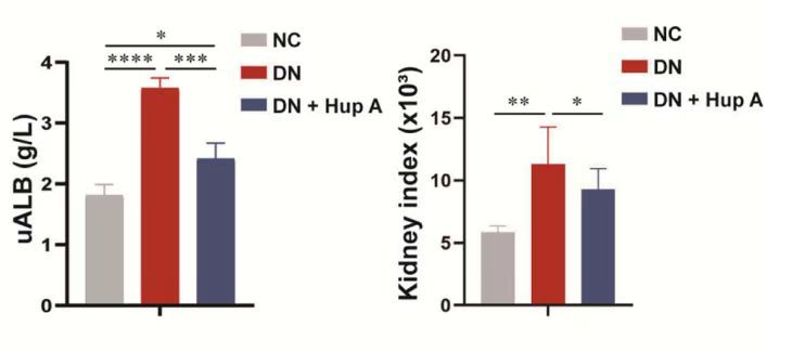 1. 肾脏保护作用:在临床中,尿蛋白是评估肾功能和损伤、提示肾脏疾病的重要指标。研究表明,在雄性SD大鼠给药石杉碱甲后,与对照的未使用石杉碱甲的DN大鼠相比,使用了石杉碱甲的DN大鼠尿蛋白(uALB)水平出现降低,并且其肾脏指数(kidney index)、血肌酐(SCr)、尿素氮(BUN)水平皆有改善。(如下图)