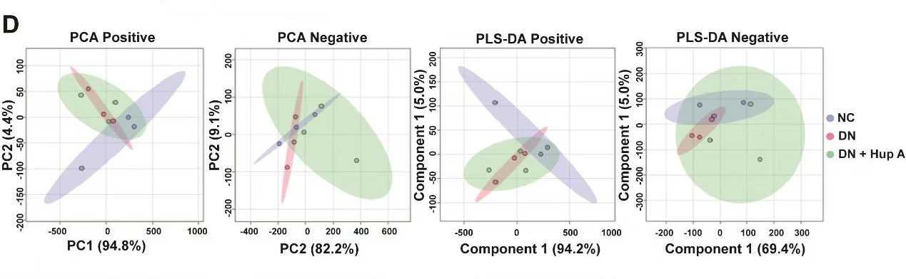 3. 代谢物调节:研究通过主成分分析(PCA)和偏最小二乘判别分析(PLS-DA)来研究肾脏代谢变化发现,NC组和DN组的样品具有显着分散性,而DN+Hup A的分布更接近NC组。这也就意味着,使用了石杉碱甲的DN大鼠的肾脏代谢相比于未用药的DN大鼠,其肾脏代谢更加接近于正常大鼠。这表明石杉碱甲治疗一定程度上恢复了DN大鼠的代谢。(如下图)