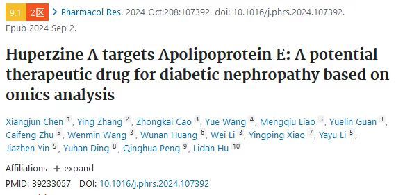 近期,由浙江大学医学院附属儿童医院肾内科团队与万邦德制药集团有限公司合作开展的石杉碱甲治疗糖尿病肾病的多组学分析研究发表了最新研究结果,研究表明了石杉碱甲在减轻糖尿病诱导的肾损伤、脂质代谢紊乱和炎症方面显示出有希望的治疗功效。该研究已发表于《Pharmacological Research》杂志,全名为“Huperzine A targets Apolipoprotein E: A potential therapeutic drug for diabetic nephropathy based on omics analysis”。